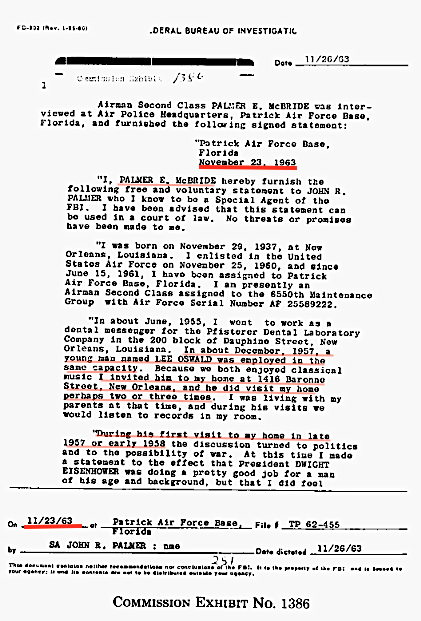 Warren Commission Exhibit 1386 is a 4 page FBI report of McBride's memories of (HARVEY) Oswald, the Pfisterer Dental Laboratory, and himself in 1957 and 1958. Originally handwritten, this memo was then typewritten by the FBI. It was later given to the Warren Commission, identified as CE 1386, and printed in the Warren Commission's 26 volumes of evidence. On the day of the assassination Palmer Edwin McBride was serving in the US Air Force and stationed at Patrick Air Force Base in Florida. That evening McBride saw and recognized Lee Harvey Oswald from his picture on television. McBride then contacted the Air Force Office of Special Investigations. He spoke with a security officer, who then contacted the FBI. FBI agent John R Palmer was immediately dispatched to interview McBride. McBride began the interview by telling agent Palmer that he had worked with Oswald at the Pfisterer Dental Laboratory in New Orleans in 1957 and 1958. McBride explained that his and Oswald's duties were to deliver dental products produced by the lab to local dentists. During breaks from their work the boys discussed astronomy, politics, and communism. McBride told agent Palmer that Oswald visited his home on Barrone St. on several occasions and together they listened to classical music.
