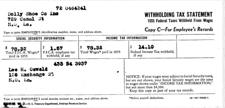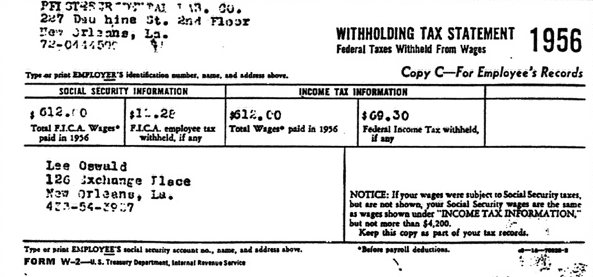 The Social Security Administration withheld details of Oswald's employment prior to 1962 that were never made available to Marina or to the Warren Commission. Why? Because Social Security records would show FICA taxes withheld and paid for both HARVEY Oswald and for LEE Oswald at the same time. The identity of the person at Social Security who made the decision, or was told not to release Oswald's 1955 through 1961 social security records, remains unknown but the coverup continues to this day.