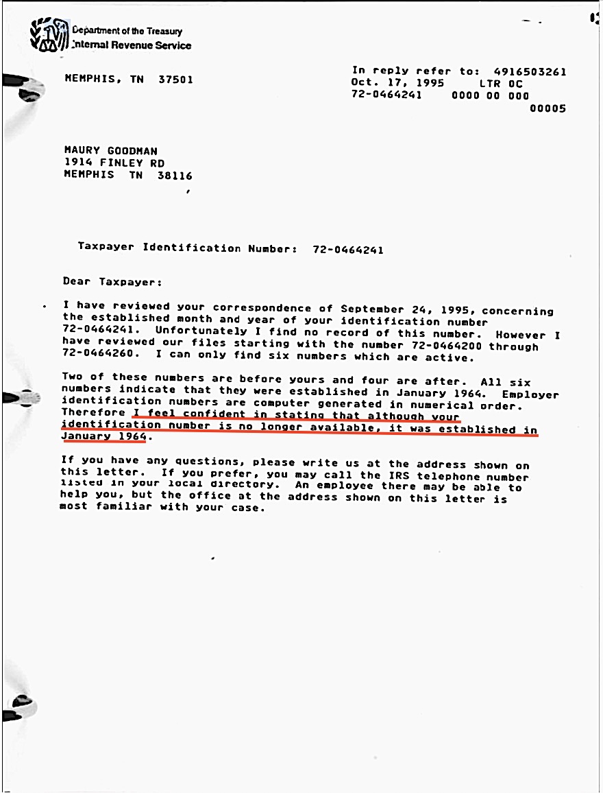The Dolly Shoe company opened for business in February, 1955 and closed their only store in New Orleans in 1957. In 1995 I contacted the former owner of Dolly Shoe, Maury Goodman, who was then living in Memphis and introduced myself. During one of our telephone conversations I asked Maury when the tax identification number for Dolly Shoe was issued. Maury was not sure of the date, and I then suggested that he contact the IRS and ask for the date the tax identification number for Dolly Shoe was created. On September 24, 1995 Mr. Goodman sent a letter to the IRS. Three weeks later, on October 17, 1995, Mr. Goodman received a letter from Internal Revenue, but after reading the letter Mr. Goodman was confused. Internal Revenue told Mr. Goodman the tax identification number for Dolly Shoe was issued in January, 1964, but Mr. Goodman knew this was impossible. Dolly Shoe was issued a tax identification number when their store opened in 1955, and their business closed two years later in 1957. How could a tax identification number be issued to Dolly Shoe in January, 1964, when this business closed in 1957 ?? If the tax identification number for Dolly Shoe was issued in January, 1964, then it appears there are no Internal Revenue Service records for Dolly Shoe before January, 1964. And no way to verify the dates of Oswald's employment, or anyone's employment at Dolly Shoe, from Internal Revenue Service records.