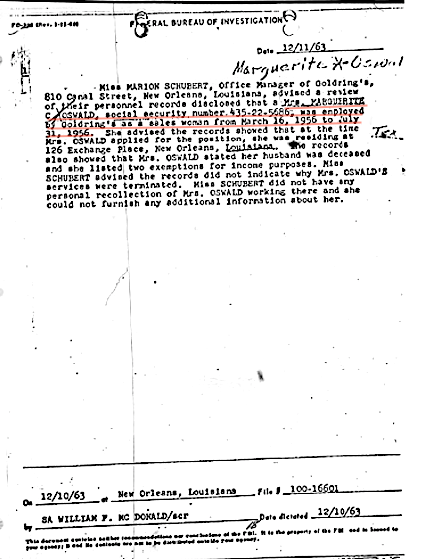 When the FBI, or any government agency, collects, destroys, and alters school records (PS44, Stripling & Beauregard), alters employment records (Dolly, JR Michaels, Tujague's, Pfisterer), denies the existence of a valid company tax identification numbers prior to 1964, confiscates LEE Oswald's Texas drivers license and his Department of Public Safety file, employment records for Marguerite Claverie Oswald disappear, W-2 and W-4 forms are fabricated, 230 unknown items are quietly placed into evidence by the FBI, and only photographs of evidence are given to the Warren Commission, then the Commission's ability to correctly piece together Oswald's background is severely limited. With the disappearance of so much evidence and deliberate fabrication of W-2 and W-4 forms, it is reasonable to assume the FBI may have had something to do with the "disappearance" of Oswald's SSA records prior to 1962, and the creation of new tax ID numbers for several companies in January, 1964 who had employed Oswald in the 1950's.