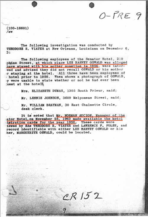 Palmer McBride knew (HARVEY) Oswald from October, 1957 thru May, 1958. McBride told the FBI that Oswald lived directly across the street from the dental lab at the Hotel Senator. The FBI then interviewed the manager of the Hotel Senator, and asked for guest registration cards for the year 1956, thereby avoiding 1957 and 1958. No registration cards were found for Oswald during the year 1956, so the FBI had no more interest in the Hotel Senator.