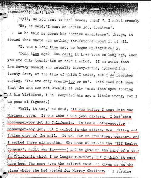 While Harvey Oswald was in the Youth House, 26 year old probation officer John Carro interviewed the short, heavy-set Marguerite Oswald impostor. This "Marguerite" told Carro that Oswald's father died at age 45, when in fact he died at age 42. She said that she and her husband were married for the first time on July 19, 1929, when in fact Marguerite Claverie and Robert E. Lee Oswald were married on July 15, 1933 and it was the second marriage for both. This "Marguerite Oswald" impostor told Carro that their family owned a home in Corning, Texas, but there was never a city in Texas with the name "Corning." She mistakenly identified her sister as Lillian Siguorette, when in fact her sister's name was Lillian Murrett. This impostor told Carro that her son was baptized at the Trinity Lutheran Church, but LEE Oswald was baptized at the Redeemer Lutheran Church in New Orleans. When asked if her former husband was right or left handed she said, "I don't remember sir." These are just a few of the errors made by the "Marguerite Oswald" impostor during her interview with John Carro, but she made many, many more errors as we shall see.