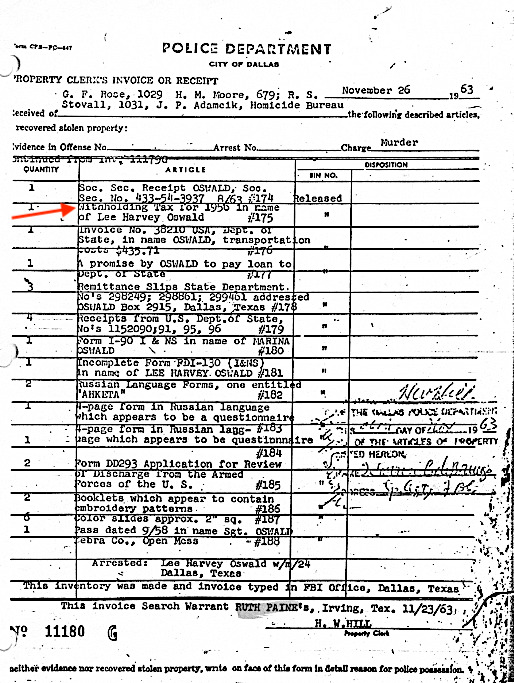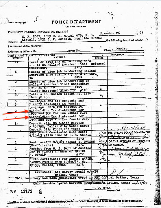 The original 225 items of evidence that were initialed, dated, and photographed by Dallas Police detectives, were sent to the FBI on November 23. Three days later, on November 26, the original 225 items of "evidence," and the additional 230 items of evidence added by the FBI, were returned to the Dallas Police. Photographs of the W-2 forms were listed as #168, #169, and #175 on the joint FBI/Dallas Police inventory, and these items were among the 230 additional items of evidence added by the FBI.The 455 items of evidence were then photographed and inventoried jointly by the FBI and Dallas police and given to the Warren Commission.