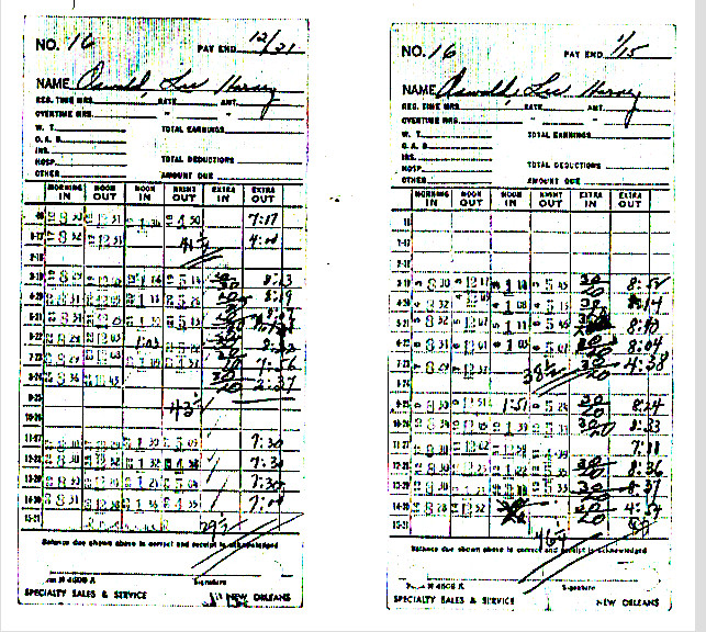 The FBI had to merge HARVEY Oswald's schooling and employment with LEE Oswald's 16 month employment at Tujague's from June, 1955 thru September, 1956. As previously discussed, LEE Oswald's time cards at Tujague's conflicted with HARVEY Oswald's attending Warren Easton High school in the fall semester of 1955. The FBI destroyed LEE Oswald's time cards at Tujague's from June thru November, 1955, which provided time for Oswald to attend high school from September 8 thru October 10, 1955. After dropping out of high school the five remaining time cards would show that Oswald worked at Tujague's from November 10, 1955 to January 14, 1956. Oswald's next job, allegedly at JR Michels for 3 days, is doutful.