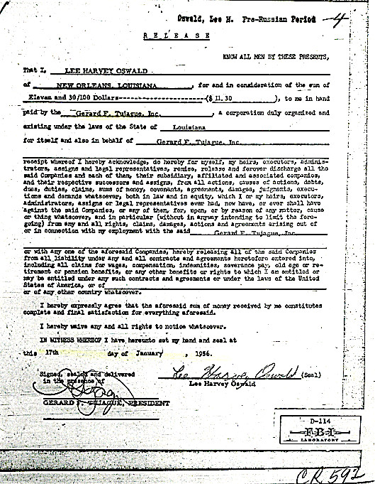Researchers who are interested in Oswald's "handwriting" should look at HARVEY Oswald's signatures on the J.R. Michels Employee Withholding Exemption Certificate and HARVEY Oswald's signature on the back side of JR Michels $34.20 payroll check. Compare the signatures of HARVEY Oswald with the signatures of LEE Oswald on the Tujagues Employee Withholding Exemption Certificate and LEE Oswald's time cards. These signatures are very different. One difference is in the formation of the letter "L." LEE Oswald normally writes a capital "L" by making a curved loop at the bottom left side of the "L." HARVEY Oswald normally writes a capital "L" by making a sharp "V" at the bottom left side of the "L."
