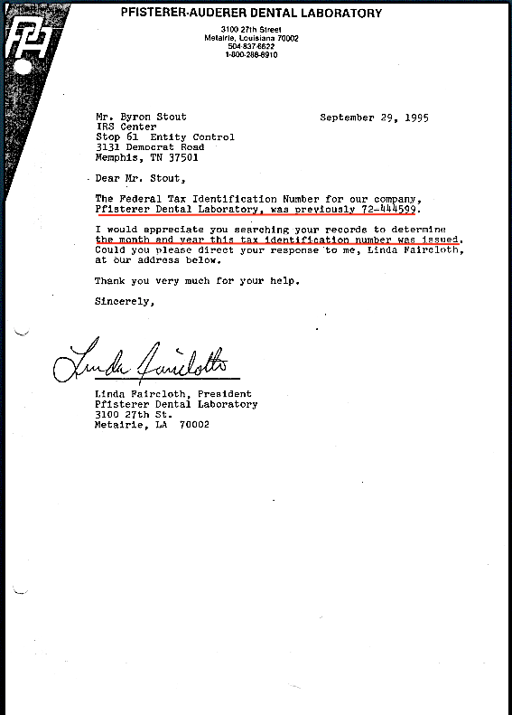Linda Faircloth told me that the Pfisterer Dental Lab was founded many years ago, long before Oswald was hired as a messenger. I suggested to Linda that she write to Internal Revenue and ask when Pfisterer was issued a company tax identification number.
