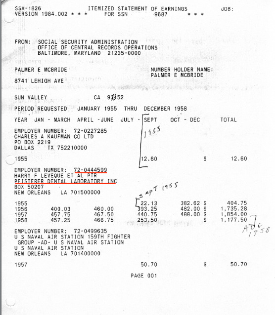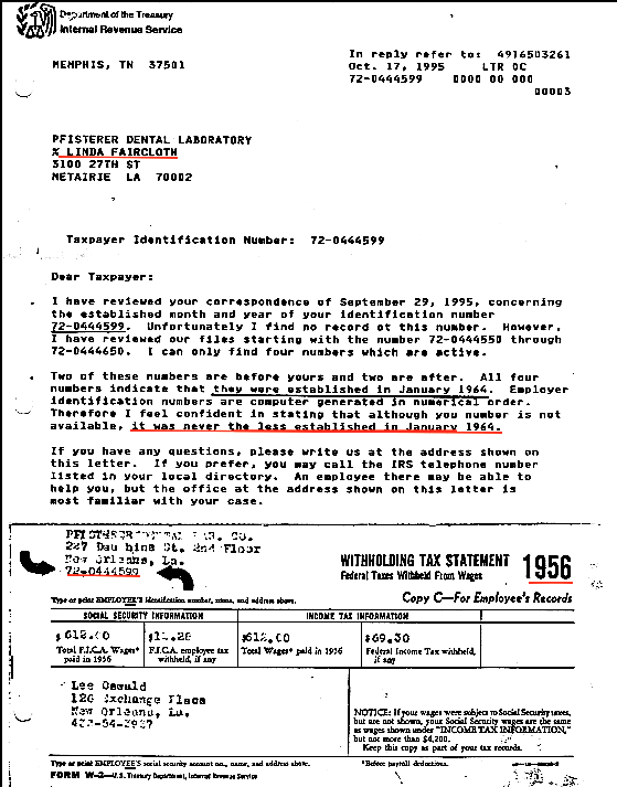 The Social Security Administration provided Palmer McBride, in Sun Valley, California, with a summary of his earnings at Pfisterer from 1955 thru 1958. The Internal Revenue Service, however, advised Linda Faircloth, President of Pfisterer's, there was no record of the Pfisterer tax identification number before January, 1964 !! No tax identification number before January, 1964 means there are no IRS records for the Pfisterer Dental Lab before January, 1964. And no way to verify the dates of Oswald's employment at Pfisterer's from Internal Revenue Service records. Our government needs to explain why the Internal Revenue Service has no record of the Pfisterer tax identification number 72-044599 before January, 1964, yet Social Security provided Palmer McBride with his earnings at Pfisterer from 1955 thru 1958 with the same tax identification number.