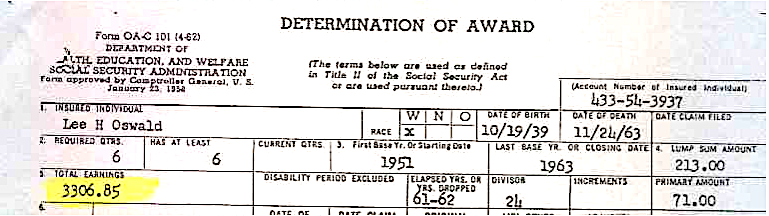 Social Security was supposed to have based Marina's benefits on Oswald's lifetime earnings from 1951 thru 1963. Yet only two months after the assassination of President Kennedy the Social Security Administration intentionally awarded only 16 months of benefits to Marina based upon (HARVEY) Oswald's earnings in the years 1962 and 1963 which totaled $3,306.85 (item #5). Without any explanation Social Security failed to include 59 months of benefits for Oswald's pre-1962 earnings from his employment at Dolly Shoe (1955), Tujague's (1955-56), J.R. Michaels (1956) the Pfisterer Dental Lab (1957-58), and the Dept. of the Navy (Marines, 1957-1959). Social security should have recorded 75 months of FICA benefits based upon Oswald's life-time employment, from 1955 thru 1963. But instead of awarding 75 months of benefits to Marina, Social Security awarded only 16 months of benefits. This is yet another government bureaucracy corrupted by the need to cover up Social Security records that would expose the existence of HARVEY Oswald and LEE Oswald prior to 1962.