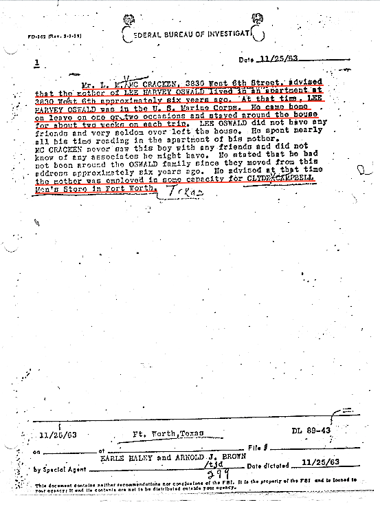 On November 25, 1963 FBI agent Arnold Brown interviewed Mr. L.M. McCracken, who said the mother of LEE Harvey Oswald was a neighbor who lived in the same building at 3830 W. 6th. McCracken said that LEE Oswald came home on leave on one or two occasions and stayed around the house for about two weeks on each trip. Marine Corps records show that LEE Oswald took leave from the Marines in February and June, 1957, before he sailed to Japan. The FBI, after interviewing Mr. McCracken, made no attempt to interview the owner of 3830 W. 6th and record the beginning and ending dates of Marguerite Claverie Oswald's tenancy, her place of employment, and additional tenants, if any. However, FBI agent Robley Madland interviewed landlady Mrs. James Taylor who said that Marguerite Oswald and her two sons, Robert Oswald and Lee Harvey Oswald, lived in the upper west apartment of her building at 4936 Collinwood from the summer of 1956 thru November, 1956. The FBI now had reports of two Marguerite Oswald's, at two different addresses in Ft. Worth, and each woman with a son named Lee Harvey Oswald.