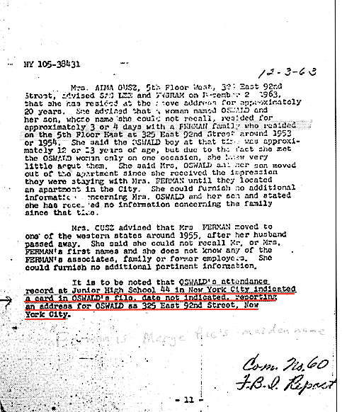 It is important to understand that both brothers, John Pic and Robert Oswald, are talking about their brother LEE Oswald attending schools in Manhattan, and not about HARVEY Oswald, who was continually truanting in the Bronx. The FBI focused their attention on HARVEY Oswald, who was accused of killing President Kennedy, and ignored any school records for LEE Oswald from Manhattan. LEE Oswald and his mother briefly resided at the 325 E. 92nd Street address when they first arrived in New York City. I believe the above FBI report describes LEE Oswald attending PS 44 in Manhattan, and using his brother's address in Manhattan. During the 1952-1953 school year HARVEY Oswald truanted continuously from PS 117, never registered at PS 44 in the Bronx, was placed in the Youth House, and then left New York City.
