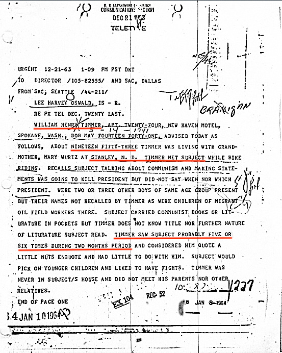 After the assassination Timmer's mother sent him some newspaper photos from the Yuma Arizona Sun. One of the photos showed Lee Harvey Oswald as he was led from the Dallas jail, and another photo showed Oswald when he was shot by Jack Ruby. Timmer's mother wrote beneath the photos, "Was he around Stanley? Seems like you knew him." Timmer said that Harvey's face had not changed too much and remembered that Oswald was very thin when he visited Stanley. Timmer wrote a letter to his mother and said this was the same boy he met in Stanley. Timmer's mother then wrote a letter to President Lyndon Johnson on December 11, 1963. She advised that her son knew "Lee Harvey Oswald" when he lived in Stanley, North Dakota. Mrs. Cole's letter was given to the Secret Service, who turned the letter over to the FBI. The FBI sent agents to interview Timmer and to interview his mother.