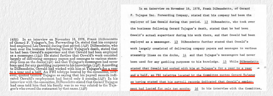 Immediately after the assassination the FBI had to find a way to merge the backgrounds of HARVEY and LEE into one, and only one, LEE HARVEY Oswald. There were three major conflicts for the FBI to sort out. The first conflict was LEE Oswald's year and a half employment at Tujagues from June, 1955 thru August, 1956 which conflicted with HARVEY Oswald working at Pfisterer in 1955, and attending Warren Easton High School in September, 1955. The second conflict was Robert Oswald living with HARVEY Oswald and his caretaker/mother for five months at 4936 Collinwood in Ft. Worth, Texas, while LEE Oswald and his mother were working in New Orleans and residing at 126 Exchange Place. The third conflict was HARVEY Oswald's employment in New Orleans at the Pfisterer Dental Lab in 1957 and 1958, while LEE Oswald was in the Marine Corps in Japan. In an honest investigation, to learn Oswald's employment history, the FBI would simply have verified the dates of Oswald's employment from business records at Tujague's and Pfisterers. Even without company records the FBI could have interviewed the company owners, staff and co-workers, requested copies of Oswald's payroll checks from their bank, or requested a schedule of payments made to the Social Security Administration on behalf of Oswald by his former employers. They also could have asked the IRS or the Louisiana Dept. of Revenue for a schedule of taxes (federal and/or state) withheld from LEE Oswald's payroll. But such information, from government records, would conflict with HARVEY Oswald attending Warren Easton High School, working at JR Michels, and working at the Pfisterer Dental Lab in 1957 and 1958 while (LEE) Oswald was in the Marines in Japan. It was obvious that the dates of LEE Oswald's year and a half work history at Tujague's had to be altered.