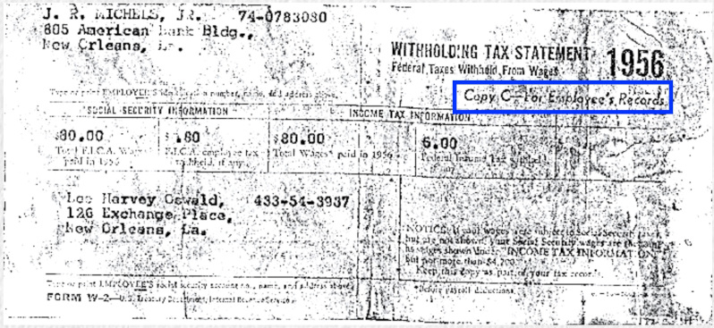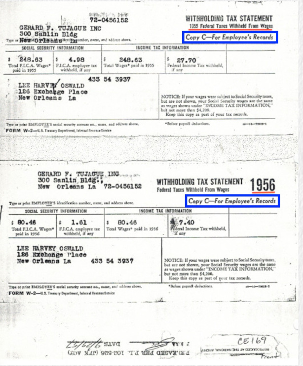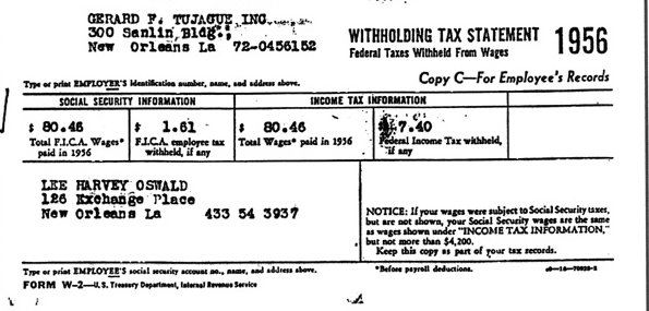 The FBI created these fake W-2 forms for 1955 and 1956. The FBI made sure that the wages listed on these forms matched the amount of wages the FBI claims were paid by Tujague's to LEE Oswald in November & December, 1955 and in January, 1956. However, neither of these W-2 forms were found, initialed, or dated by Dallas Police detectives at Oswald's rooming house or at Ruth Paine's. These W-2 forms were created by the FBI in Washington, DC between November 23 and November 25, 1963, and then returned to the Dallas Police on November 26, 1963. In Dallas the W-2 and W-4 forms were inventoried and photographed jointly by the FBI and the Dallas police.