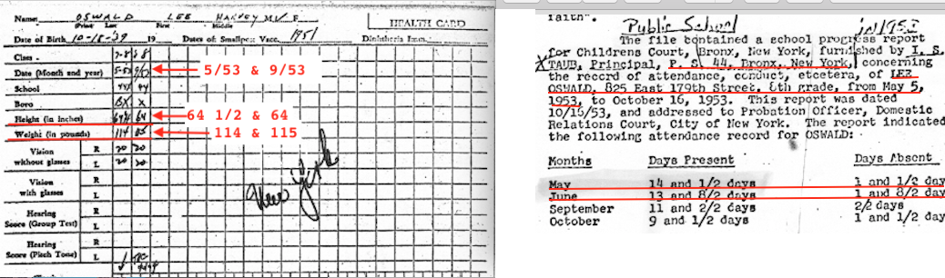 The school health card shown above is for PS 44 in the Bronx, is dated "May, 1953" and was published by the Warren Commission (CE1384). LEE Oswald's height was recorded as 5 ft 4 1/2 inches and his weight as 114 lbs--clearly not the 4 ft. 8 inch HARVEY Oswald who was interviewed by Dr. Kurian at Youth House the previous month. Or the malnourished youth remembered by Dr. Hartogs in the Youth House. Or the skinny boy remembered by social worker Evelyn D. Siegel, Or the small boy remembered by probation officer John Carro. It was the tall, husky LEE Oswald who attended PS 44 in the Bronx in the late spring semester of 1953.