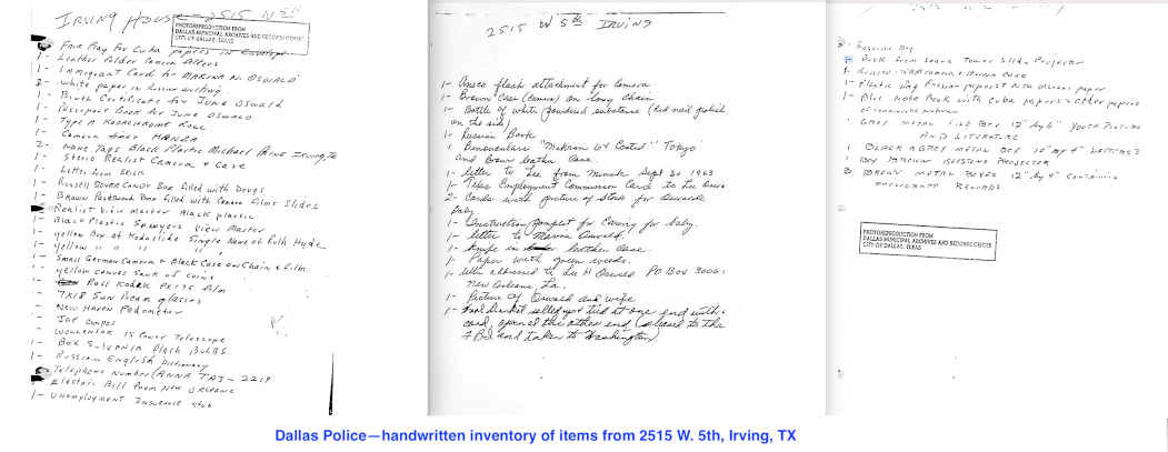 Each and every item taken was initialed and dated by Dallas Police detectives, listed first on a handwritten inventory, and then listed on a type-written inventory at DPD headquarters. Later these inventory lists were identified by the Warren Commission as Stoval A, Stoval B, and Turner 1. Not a single W-2 form or W-4 form was found by Dallas Police detectives. Around midnight all 225 items of evidence collected by the Dallas Police were photographed on the floor of the Dallas Police station, but there were no W-2 or W-4 forms. On the early morning of November 23, all 225 items collected by the Dallas Police were sent to FBI headquarters in Washington, DC.