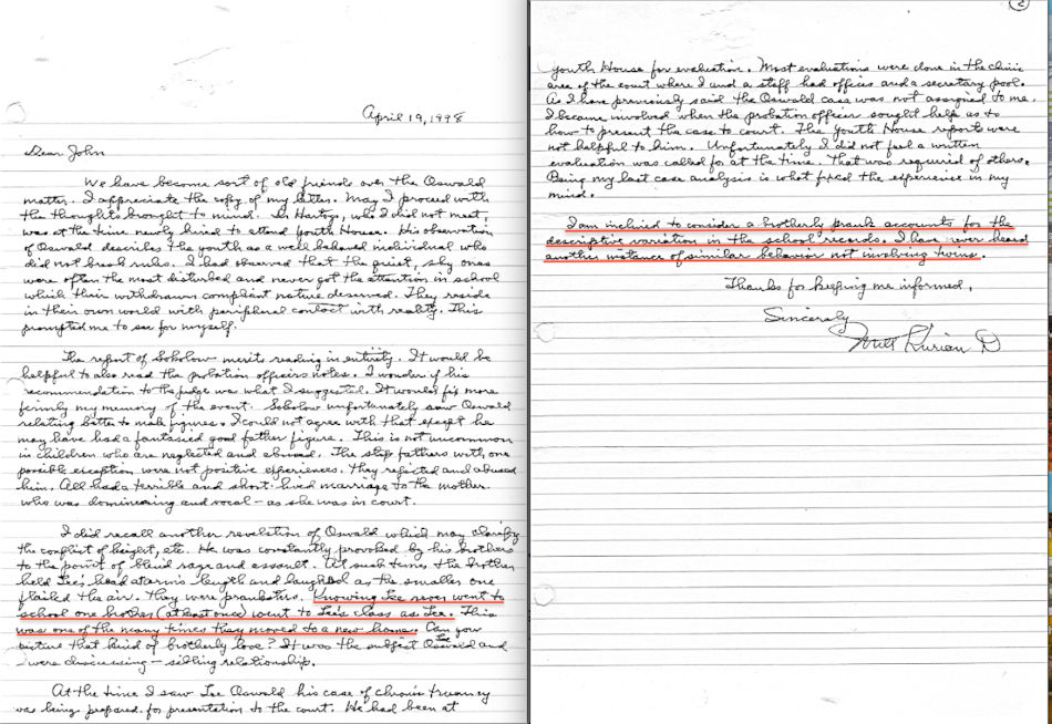 Dr. Kurian said, “There appeared in the doorway a rather thin, short young man in knickers. I was immediately attracted to his way of entry. He had one foot in the door when he looked about the room in a studied fashion to see if it was all clear. He finally came in and sat down." Dr. Kurian was surprised to learn that Oswald was only 13 years old. Dr. Kurian said, "He appeared quite small for his age and stood no more than 4 ft 6 or 4 ft 8. He was very quiet and introverted.... He spoke of having several stepfathers, and I was informed that his mother had 5 marriages. So far as the truancy was concerned, he had no motivation to go to school and part of this lack of attachment to school was due to the fact that his family moved many times and he lost interest in having friends.... I've always been about 5 ft 7. He came up to my chest, maybe 4 ft 8 inch. I thought this individual was much more disturbed than others paid attention to. I have never seen a child so paranoid. He looked like an abandoned child, who has not had the opportunity to develop himself, to free himself from interaction with adequate parents. He was full of anger and frustration and he was distrustful and I felt much in need of further review of therapy.” The interview lasted about 45 minutes.