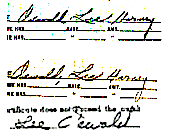 Researchers who are interested in Oswald's "handwriting" should look at HARVEY Oswald's signatures on the J.R. Michels Employee Withholding Exemption Certificate and HARVEY Oswald's signature on the back side of JR Michels $34.20 payroll check. Compare the signatures of HARVEY Oswald with the signatures of LEE Oswald on the Tujagues Employee Withholding Exemption Certificate and LEE Oswald's time cards. These signatures are very different. One difference is in the formation of the letter "L." LEE Oswald normally writes a capital "L" by making a curved loop at the bottom left side of the "L." HARVEY Oswald normally writes a capital "L" by making a sharp "V" at the bottom left side of the "L."