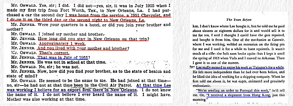 The FBI gave the Warren Commission no documentation whatsoever to verify the dates of Oswald's employment at Pfisterers. But the Warren Commission had an FBI report of their interview with Palmer McBride, who said he worked with Oswald in New Orleans in 1957 and 1958, at the same time LEE Oswald was in Japan. The Warren Commission was well aware of this conflict, and knew they had to avoid McBride, avoid employees and records from the Pfisterer Dental Lab, and find a way to avoid the years 1957 and 1958. The Warren Commission had to completely avoid Palmer McBride. The Commission decided to interview McBride's friend, William Wulf, who casually knew Oswald. The Commission then chose Wesley Liebeler, the assistant counsel of the Warren Commission, to question Mr. Wulf. Wesley Liebeler knew there was a serious problem with one Lee Harvey Oswald working in New Orleans for 8 months in 1957 and 1958, while at the same time another Lee Harvey Oswald was in Japan. In preparation for William Wulf's testimony, Liebeler prepared a carefully worded opening statement. At the beginning of Wulf's testimony, attorney Liebeler said to Wulf, "We want to inquire of you concerning possible knowledge that you have of Lee Harvey Oswald during the time that he lived in New Orleans during the period 1954-55." NOT THE YEARS 1957 AND 1958 AS TOLD BY PALMER MCBRIDE, BUT THE YEARS WERE CHANGED BY WESLEY LIEBELER TO 1954/1955. The Warren Commission, thru Wesley Liebeler, had intentionally tried to change Oswald's employment at Pfisterer's from 1957 and 1958 to the years 1954 and1955, which was before Oswald joined the Marines in 1956. Without any objection, the Warren Commission was then able to claim that after Oswald's employment at JR Michels in 1956, Oswald worked "for several months thereafter" at the Pfisterer Dental Lab, without a shred of evidence.