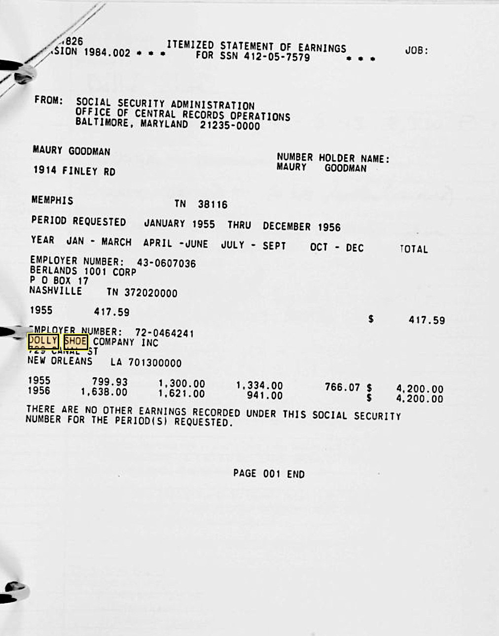 After discussing the confusing letter from Internal Revenue I suggested to Mr. Goodman that he contact Social Security, provide the Dolly Shoe tax identification number, and request Social Security records for 1955 and 1956. Mr. Goodman soon received a letter from Social Security with the records he requested. Now both Mr. Goodman and myself wondered why Social Security would have records available for Dolly Shoe in 1955 and 1956, but internal revenue had no records for Dolly Shoe prior to January, 1964. Our government should explain why the Internal Revenue Service has no record of the Dolly Shoe tax identification number 72-0464241 before January, 1964, yet Social Security provided Mr. Goodman with Dolly Shoe records in 1955 and 1956 with the same tax identification number.