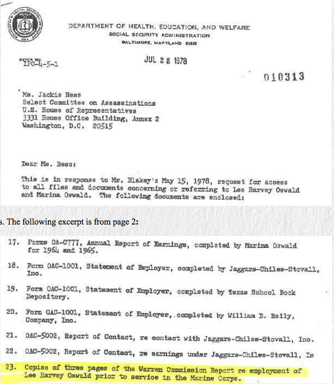 In 1978 the House Select Committee on Assassinations wrote to the Social Security Administration and asked for copies of Oswald's file. The Social Security Administration responded by providing Oswald's employment records for 1962 and 1963. But for Oswald's employment records prior to 1962 the Social Security Administration advised the House Select Committee to review the Warren Commission report. It is very difficult to believe the Social Security Administration would tell the House Select Committee on Assassination to ask the Warren Commission for employment records prior to the Marine Corps. But that is exactly what they did. It is obvious that in 1978 someone at the Social Security Administration knew, or was told, there was a problem with LHO's pre-1962 income. That someone knew there was a big problem and was trying hard to avoid the issue 15 years after the assassination. It is obvious that in 1978 someone at Social Security knew there was a problem with LHO's pre-1962 income. That someone knew there was a big problem and was trying hard to avoid the issue 15 years after the assassination.