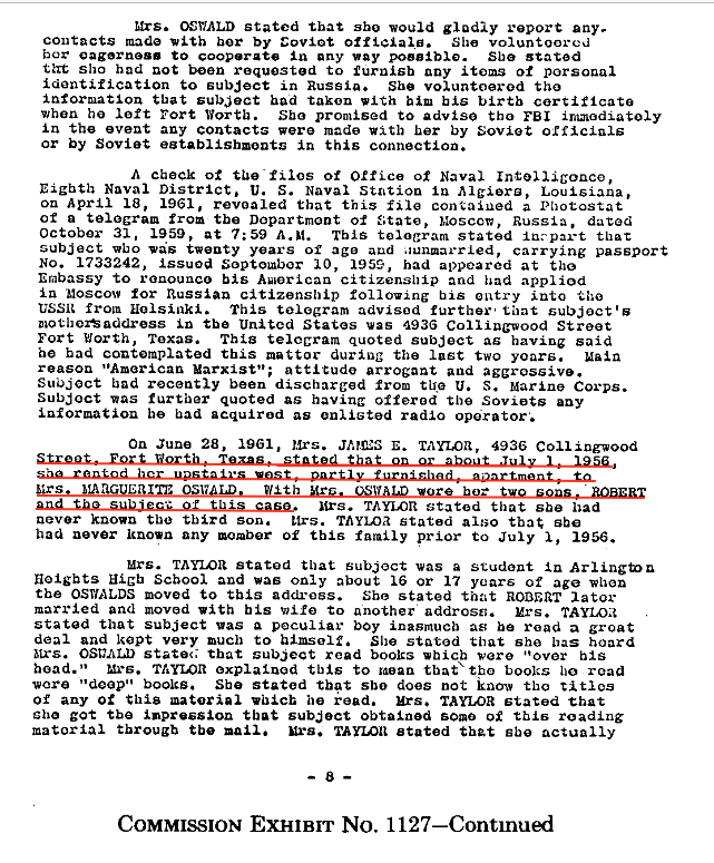 The landlady at 4936 Collinwood was Mrs. James Taylor. Mrs. Taylor told the FBI that Lee (HARVEY) Oswald lived in this apartment until he joined the Marines in October. Mrs. Taylor said that Robert Oswald stayed in the apartment until he and Vada were married on November 21, 1956. Prior to his marriage to Vada Mercer Robert Oswald never introduced his future wife to HARVEY Oswald or to the Marguerite Oswald imposter, even though he was living with both of them. No need for an introduction, because these people were not related to Robert Oswald.