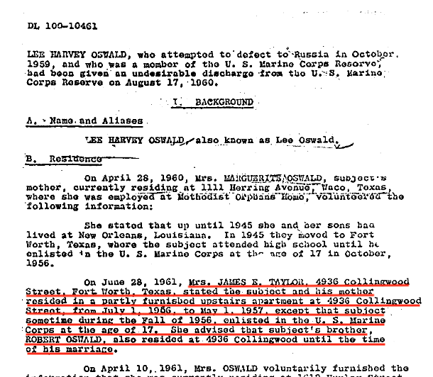 June, 1956, HARVEY Oswald, Robert Oswald, caretaker/mother live together at 4936 Collinwood, Ft. Worth, TX
