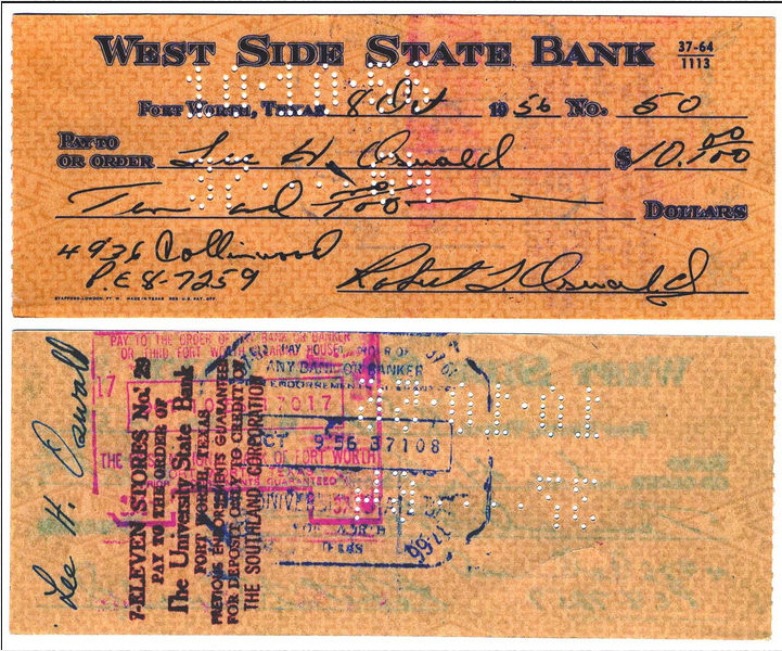 On October 8, 1956, Robert Oswald wrote a $10.00 check from his account to "Lee H. Oswald," which was cashed at a nearby Seven Eleven store by HARVEY Oswald. On the front of this check Robert wrote his address as 4936 Collinwood, and phone number PE 8-7259.